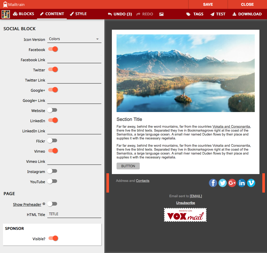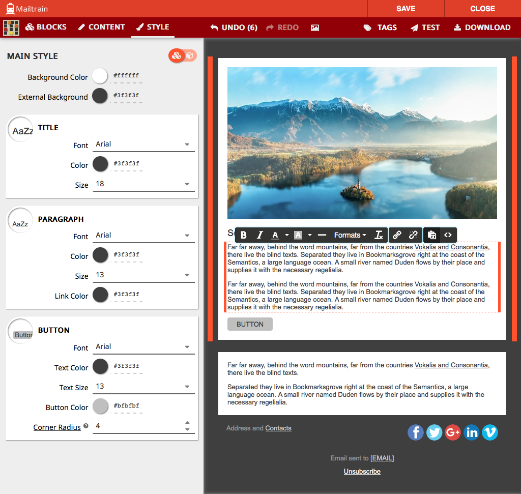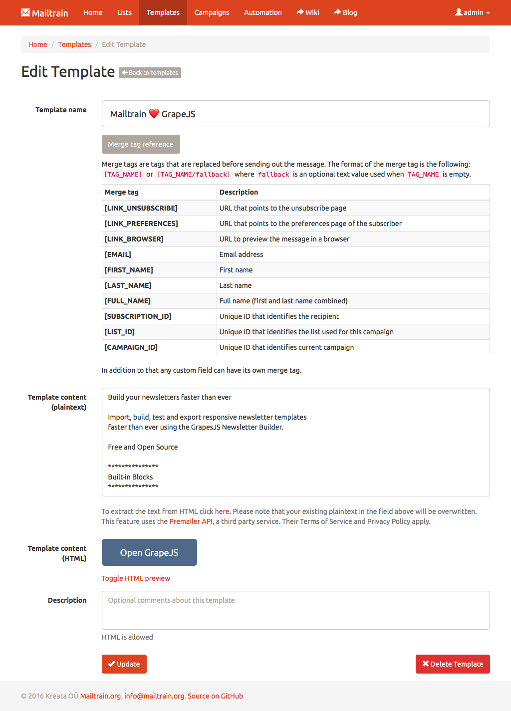 Mailtrain ships with GrapeJS and Mosaico built in, two advanced template editors. Mailtrain also offers a code editor if you prefer to handcraft the HTML yourself.